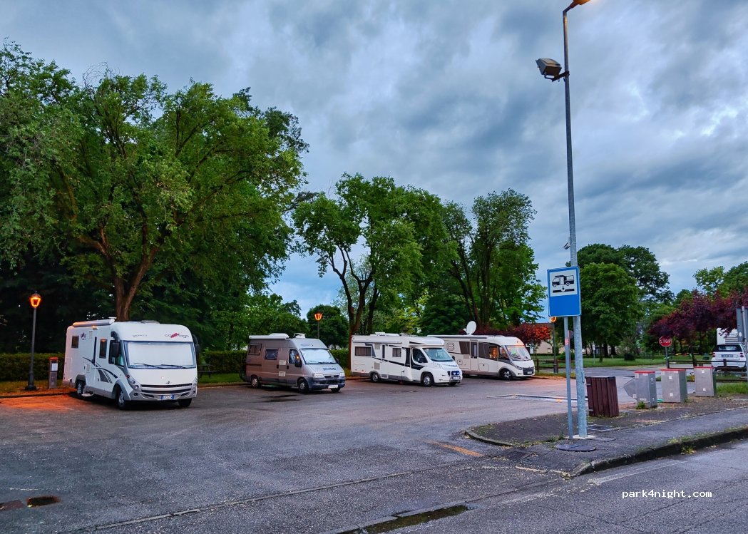 Great little Sosta next to a nice village and big park. Free electricity! Very quiet. The only negative thing - very bright lights.