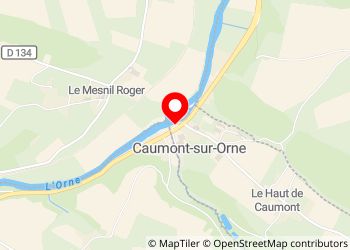 Aire de pique-nique ombragée avec 5 tables au bord de l'Orne, route à proximité.