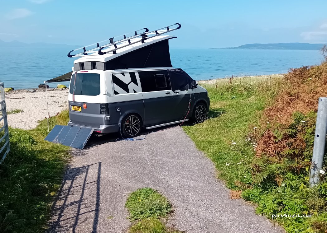 A small spot off the main road, down a tarmac slope to grass. The spot is direct on to the beach. Enough space for our motorhome (6.2m long)