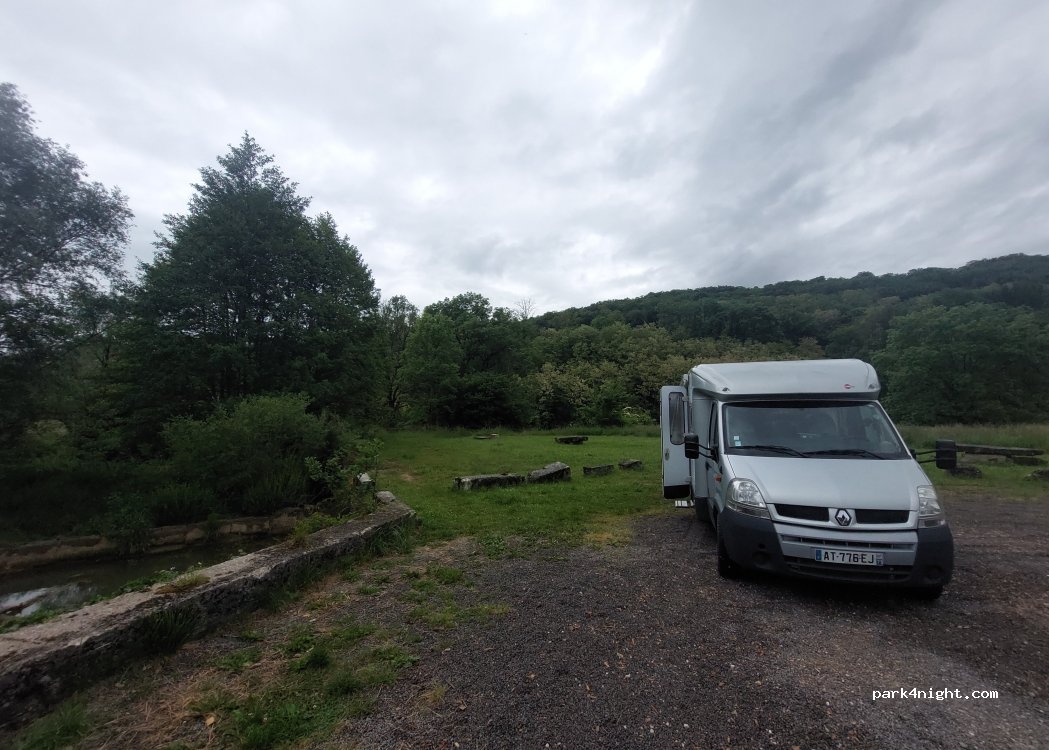 Pretty spot fitted out with picnic table on the banks of the Suran. A few cars come for a picnic at noon. (please give them space) Contrary to appearances, it is possible to access it easily and to turn around, even with a> 7m.