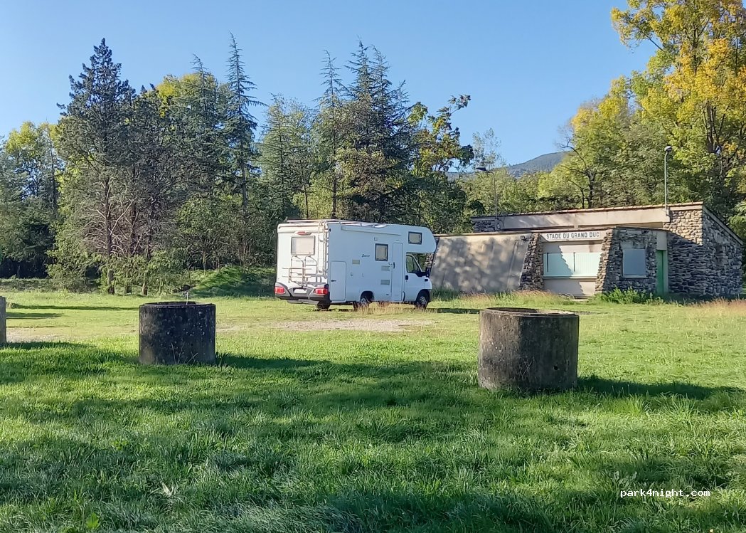 Tranquilo campo de césped plano en el estadio Grand Duc, las cigarras y los pájaros nos acompañaron sin carretera muy transitada ideal con perros Lo recomiendo mucho