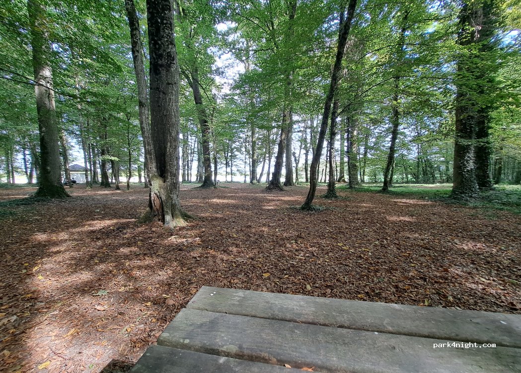 bel endroit ombragé pour un pic-nic et balades au bord du lac . Quelques tables en bois a disposition. il y a effectivement un panneau " camping interdit " , mais on a pu entrer avec le camping car sans contrainte de hauteur (fin septembre )