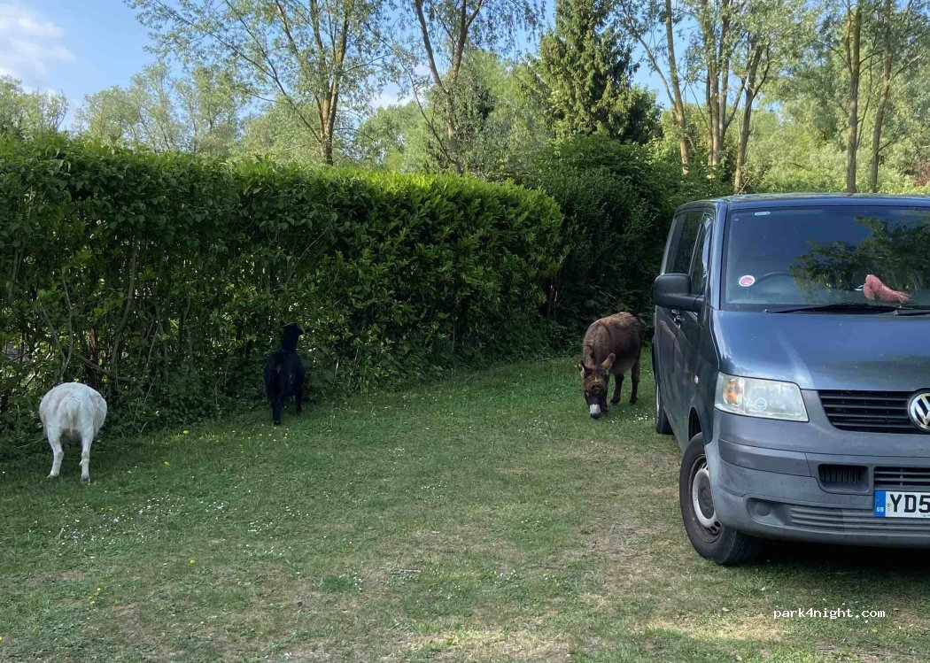 à côté d'un bel étang plein d'oiseaux .un coin de nature avec des animaux, des yourtes .tipi .bule transparente et autres .des emplacements de camping car bien délimités et en plus des propriétaires très sympathiques. nous avons bien apprécié nos 3 nuits dans ce bel emplacement .les sanitaires sont propres .