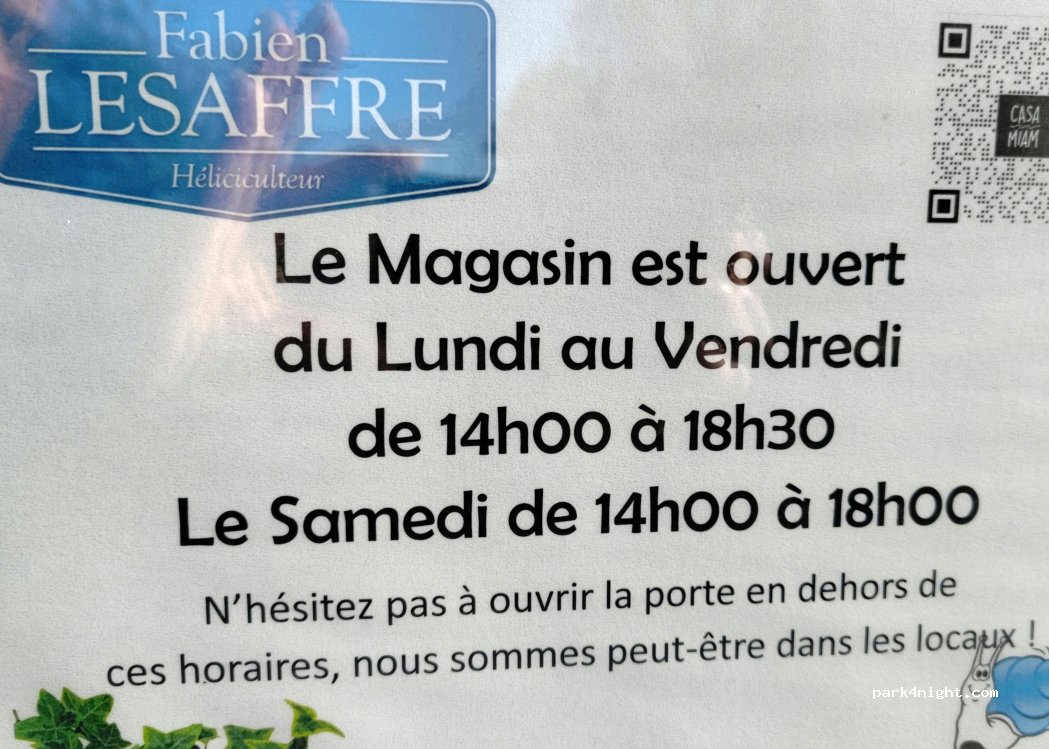 To diversify its activity, the Lesaffre snail farm has opened a service and parking area for campers. Lille is at -40mn bus, a bus stop is 15 minutes walk from the area. You can call the number is available to PRO subscribers, for further information or to reserve!