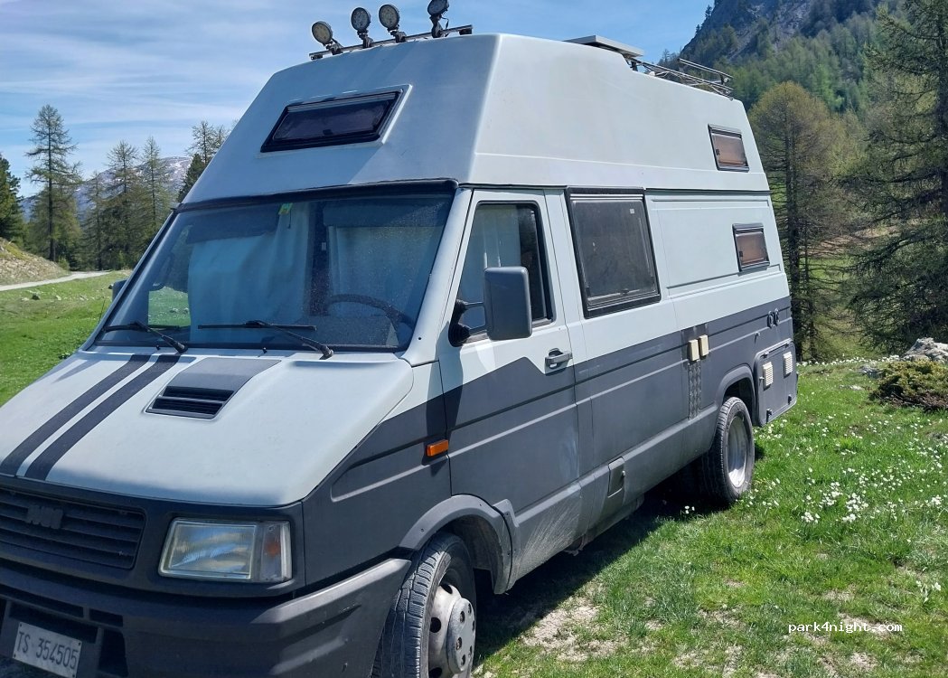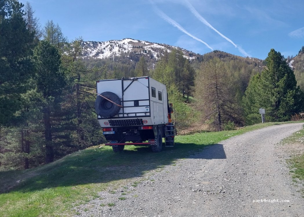 Hikers' parking lot at Lago Nero. There are several parking spaces along the street, but not many are flat for overnight stays. Lots of hikers' cars at the weekend. Absolutely quiet in the evening. Access via a rough gravel road. Only for small vans (VW California etc) or off-road campers. But if you can drive you don't need a 4WD. Starting point for many hikes and bike tours.
