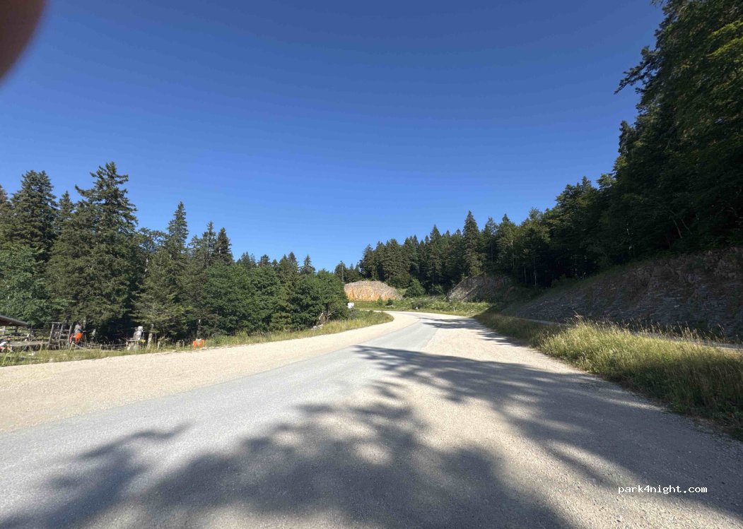 Grand parking pour dormir au frais et au calme. Près des départ de randonnées, luge d’été ( qui a bcp de succès), tyrolienne, remontée mécanique pour un point de vue grandiose sur la Suisse.