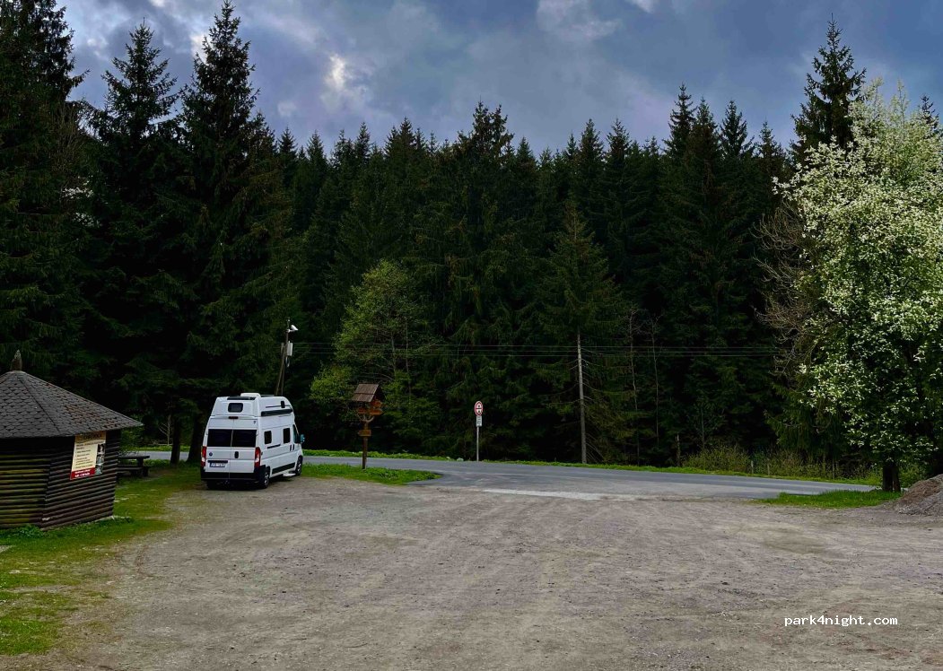 Schöner Parkplatz am Waldrand. Tagsüber sehr viel los, viele PilzsucherInnen und SpaziergänngerInnen. Abends ruhig. Nachteile: man hört die Straße, durch die Tiere viele Fliegen, im Pferdestall nebenan wird viel gebrüllt.