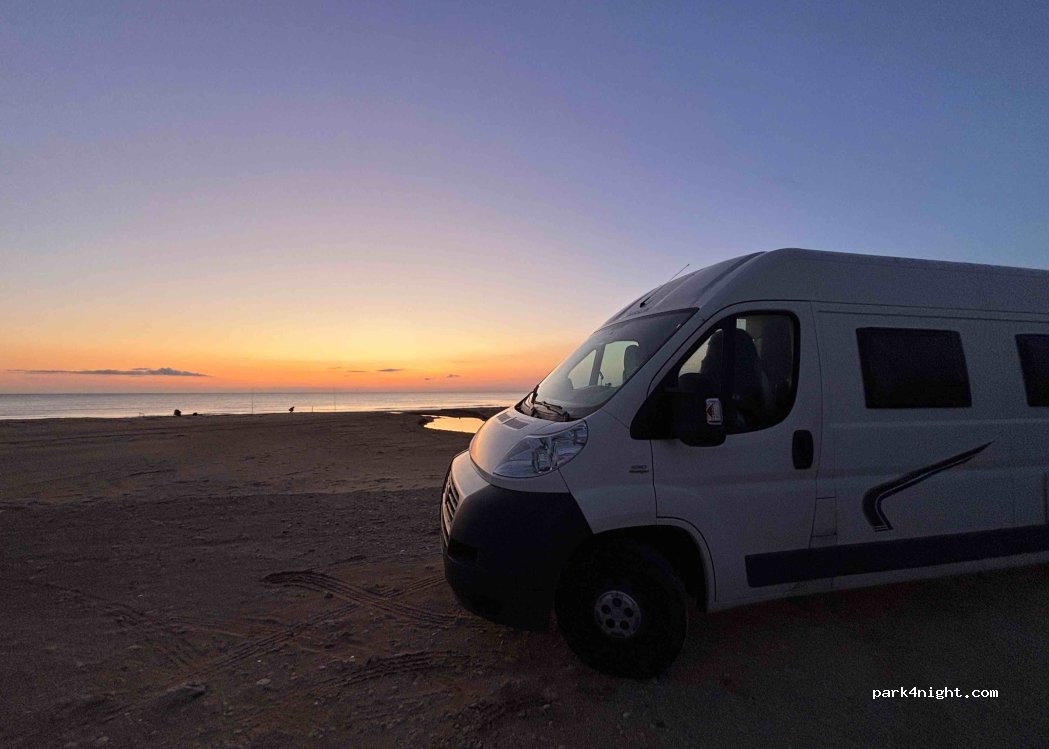 Attention il y a un sens interdit là où les GPS nous font tourner : pas de souci à le prendre. parking plat, plusieurs places Juste devant la plage. Habitations autour et salle où cette nuit c’était la fête. Musique jusqu’à 3h du mat. Mais on était samedi soir et porte du van fermée, ça passe. Il y a mieux, mais c’est correct et ça rend bien service. Par ici, on ne peut pas faire les difficiles.
