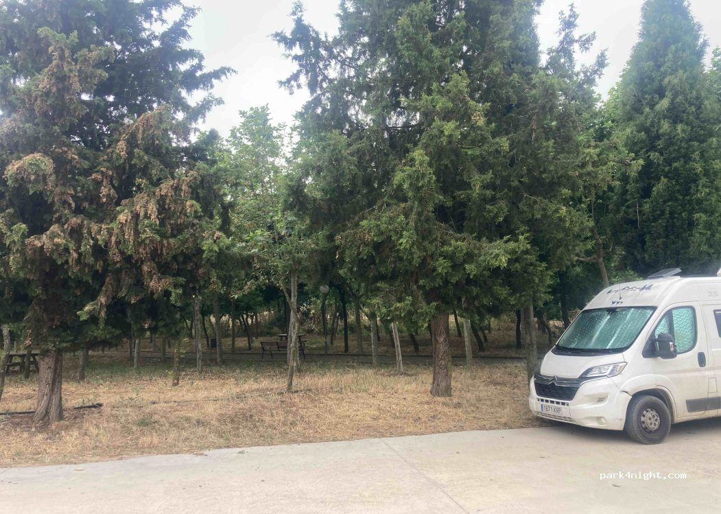 Park "La Alameda". Good place with several picnic areas, lots of shade, with a good playground for both children and adults. ATTENTION: not suitable for caravans! The passages are too narrow and the streets not wide enough. They have a source of drinking water next to the fronton. Very quiet place to stay en route, a few kilometers from the highway.