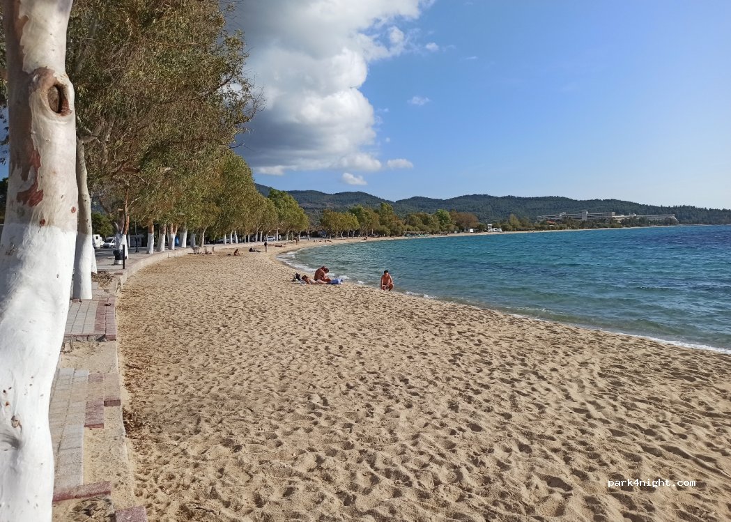 Parking OK, nawet w sezonie są miejsca. Wieczorem ok. 22:00 już jest na tyle luźno że można przepakować pod drzewa rano dające cień. Boisko podświetlane użytkowane do północy, samochody sporadycznie jeżdżą w nocy. Parkuj z dala od tawerny z uwagi na wentylator który oprócz hałasu roznosi też nieprzyjemny zapach. Na noc na szczęście wyłączany.
