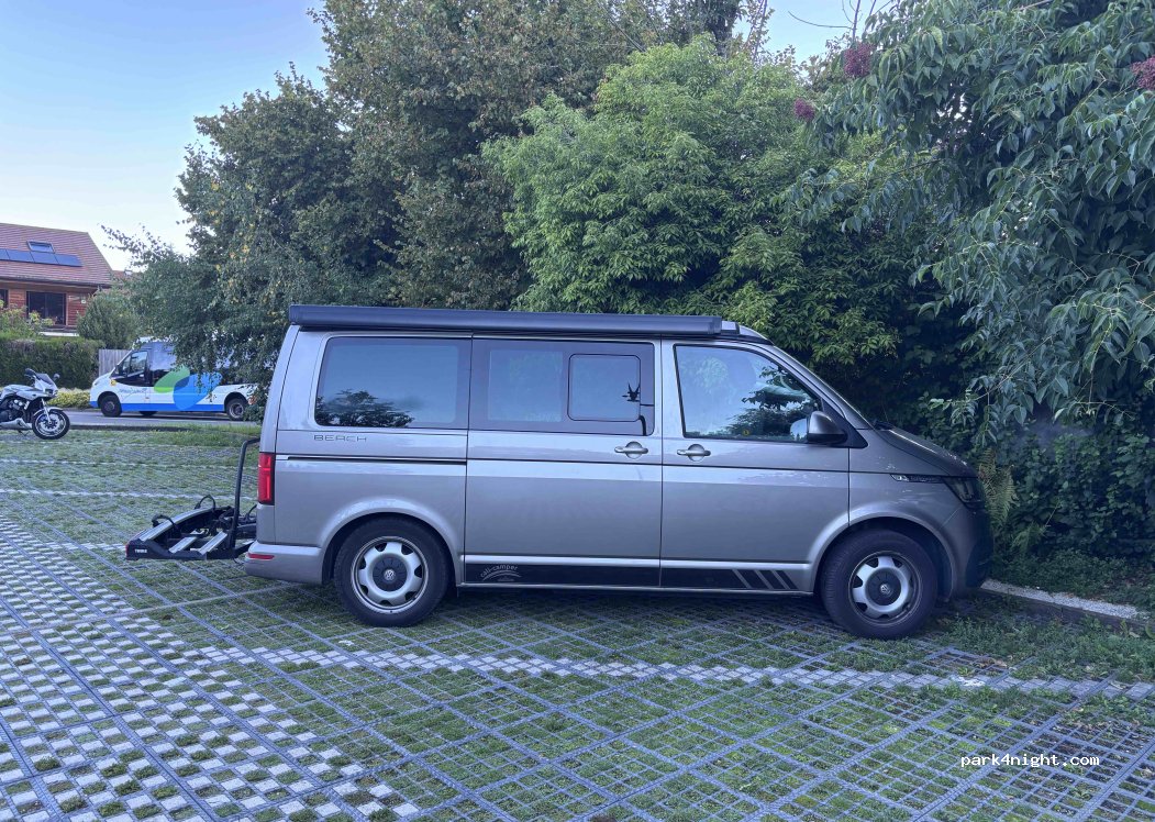 Day and night parking with height limited to 2 meters, approximately 50 spaces. Beach access 100 meters away. Quiet at night, full during the day but arriving early in the morning or in the evening plenty of places. We spent two carefree nights. Annecy center 20min walk. Water point not functional during our visit.