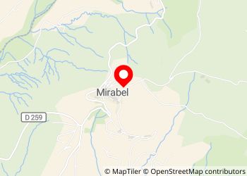 Kleiner Kiesparkplatz mit Blick auf das Dorf Mirabel aus der Vogelperspektive.