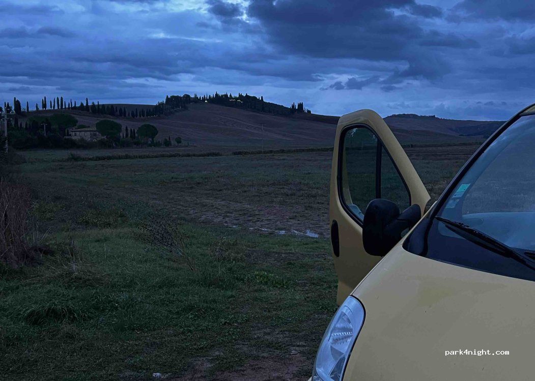 Descripción: “es una zona inicial de un camino de tierra en el que caben unos 3-4 coches. Se escuchan un poco los coches pasar durante la noche. A la mañana es un sitio en el que algún que otro turista se pasa a hacer fotos” Valoración: “Buen sitio para pasar una noche con la furgoneta, con vistas a la toscana. Hay insectos por lo que el autan es necesario. Semi-tranquilo y llano”