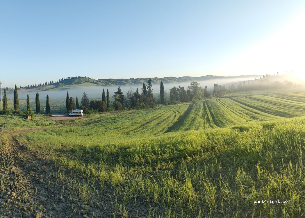 très joli spot, arrivés de nuit après "une soirée belle à Sienne" ;-) un lever de soleil magique avec la brume il y a quand même un peu de circulation sur la piste jusque tard (accès à des résidences)