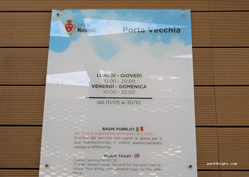 11.09.25 Great location, level walk into Centro Storico, busy public car park, suggest 6m camper max, we paid €21 1630-1000, managed toilets & showers adjacent very clean €1wc - states open 0700-0100 but?closed 2000 and not open in morning. Tickets checked by attendant. Car park empty overnight, very little noise, near park, beaches, shop, cafe, bar, great view of the sea and Monopoli. Recommend