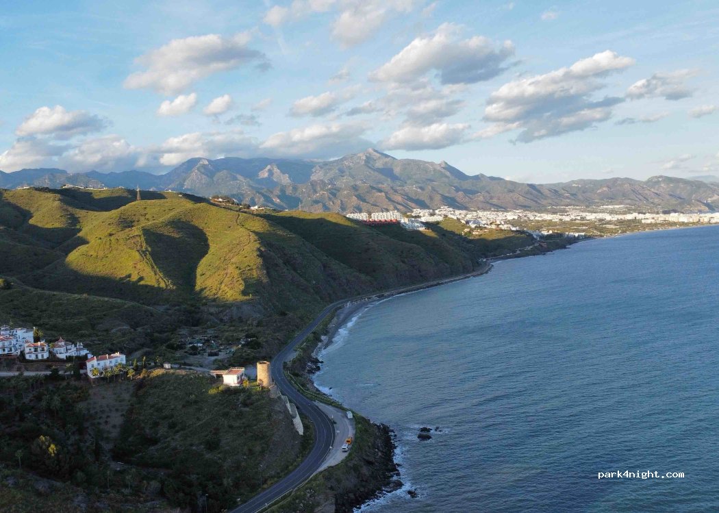 level, wide parking. Close to the road but very quiet at night. Not far from Nerja. Not far from Frigiliana. By the sea. Stunning sunrise.