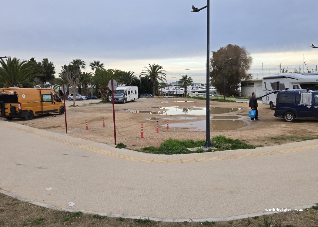 Viel besserer Platz und ruhiger gelegen zwischen Yachthafen und einem schöem Strand. Da der Platz geschottert ist, gibt's im Winter ab und zu Pfützen, dadurch sind aber keine Kinder mit Rollern da, die hier Lärm machen. Nur einige Angler stellen Ihr Fahrzeug ab um vorne auf dem Pier Fische zu fangen.