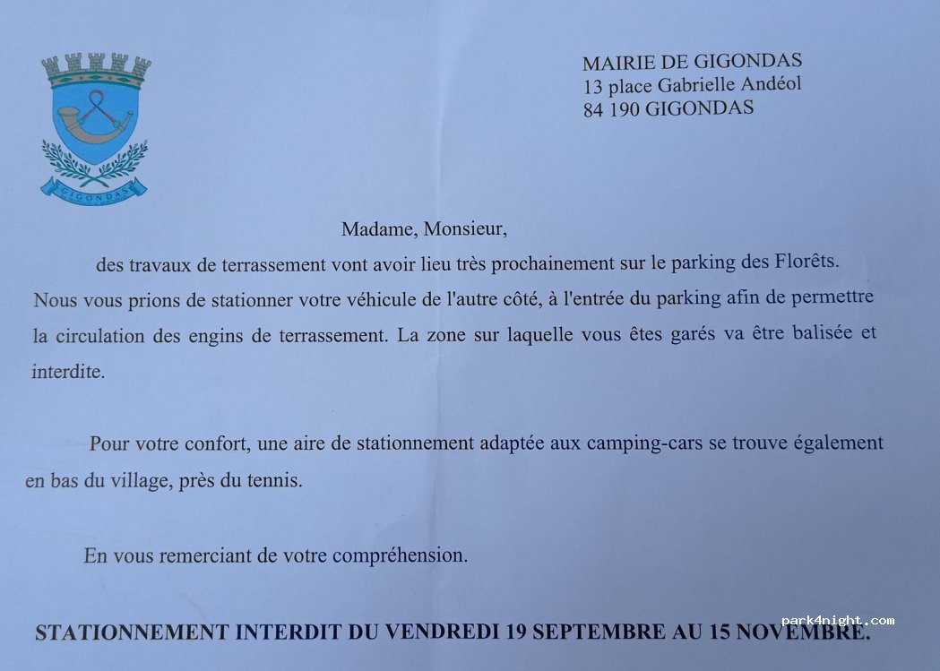 En camping car : accès facile, grand parking plat, personne d’autre la nuit, vue sur les dentelles. Aire de servicegratuite au village