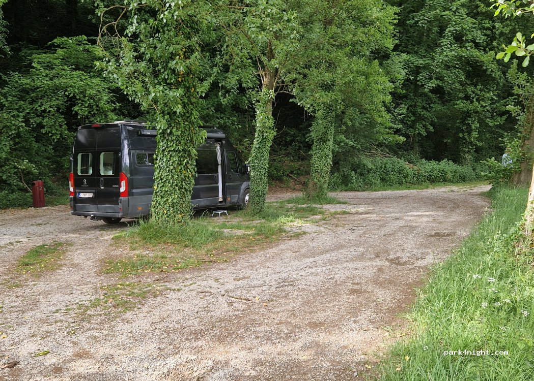 Kleine parking op kiezels aan een riviertje. Vuilnisbak aanwezig. Ideaal als tussenstop voor een rustige nacht.