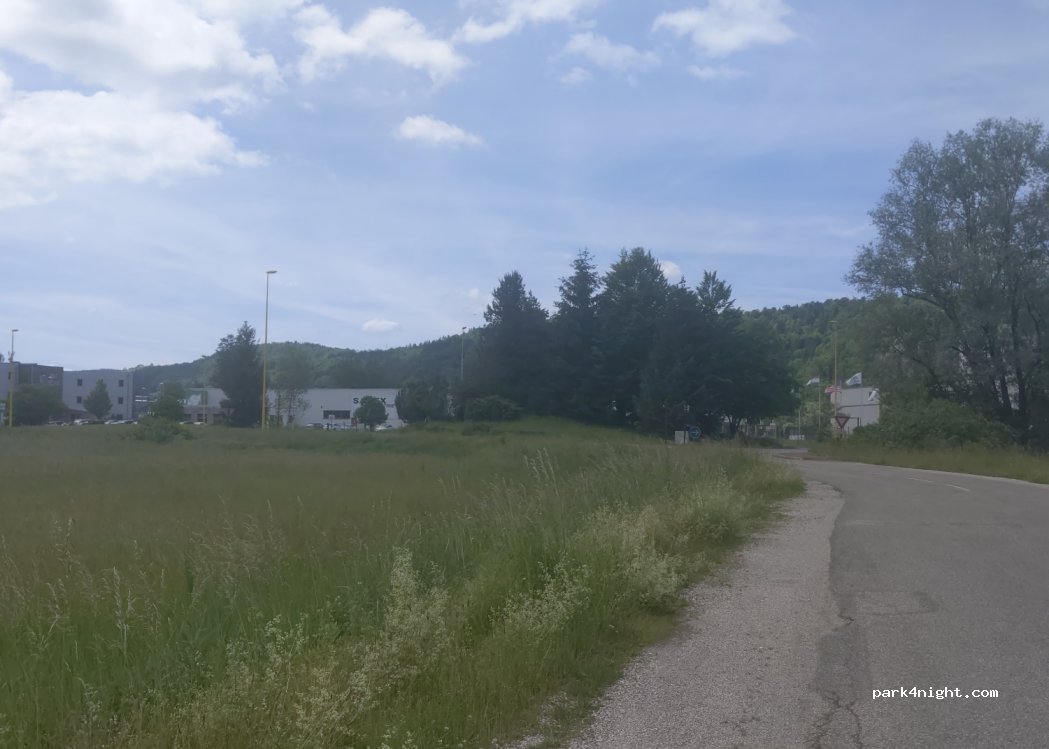 Ebener Schotterplatz mit schöner Aussicht. Außer einem Abfalleimer gibt es keinen Service.