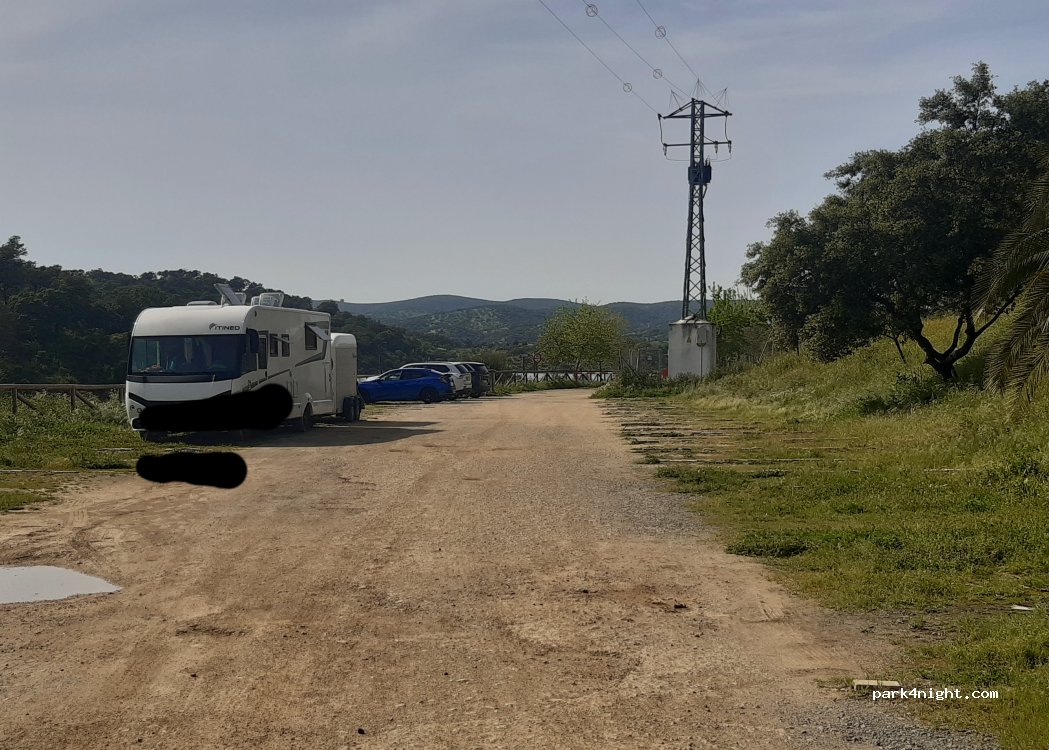 Nice park up at the beginning of the Via Verde El Ronquillo. Restaurant is extremely busy at weekends and both car parks are packed, best to come after 18.00 if you want to stay overnight.We didn’t bother with the restaurant as the owner was rude to us. No signs anywhere prohibiting motorhomes so ignore him. Peaceful at night, nearby cockerel will wake you at 5.30!