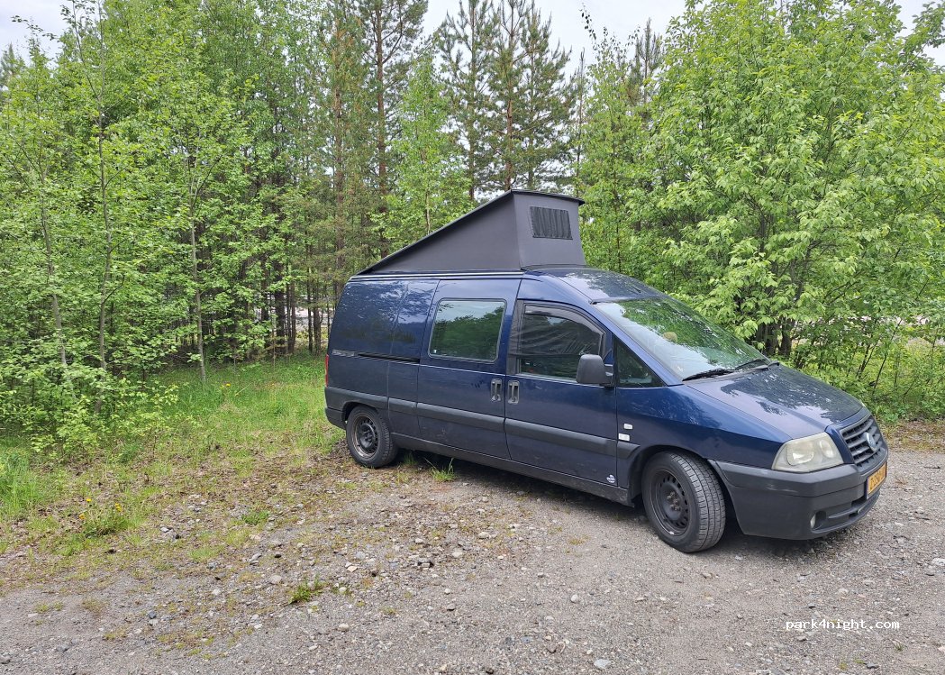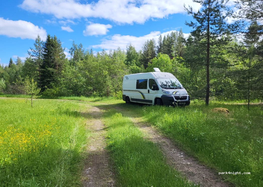 The place is nice for a stop, we did, but cold also do for a night. There is at table and ready for bonfires. Fishing in the river is possible. We arrived in our camper 7.8 m.