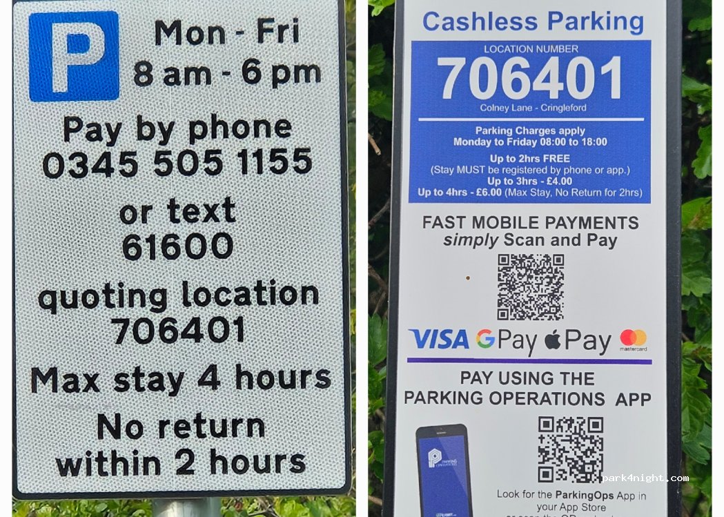 Signs have changed since we stayed in 2023, but restrictions are only Mon-Fri,8am- 6pm. We stayed Fri night without any issues. From signs: Mon - Fri 8 am - 6 pm Max stay 4 hours No return within 2 hours Parking Charges apply Monday to Friday 08:00 to 18:00 Up to 2hrs FREE (Stay MUST be registered by phone or app.) Up to 3hrs - £4.00 Up to 4hrs - £6.00 (Max Stay, No Return for 2hrs)