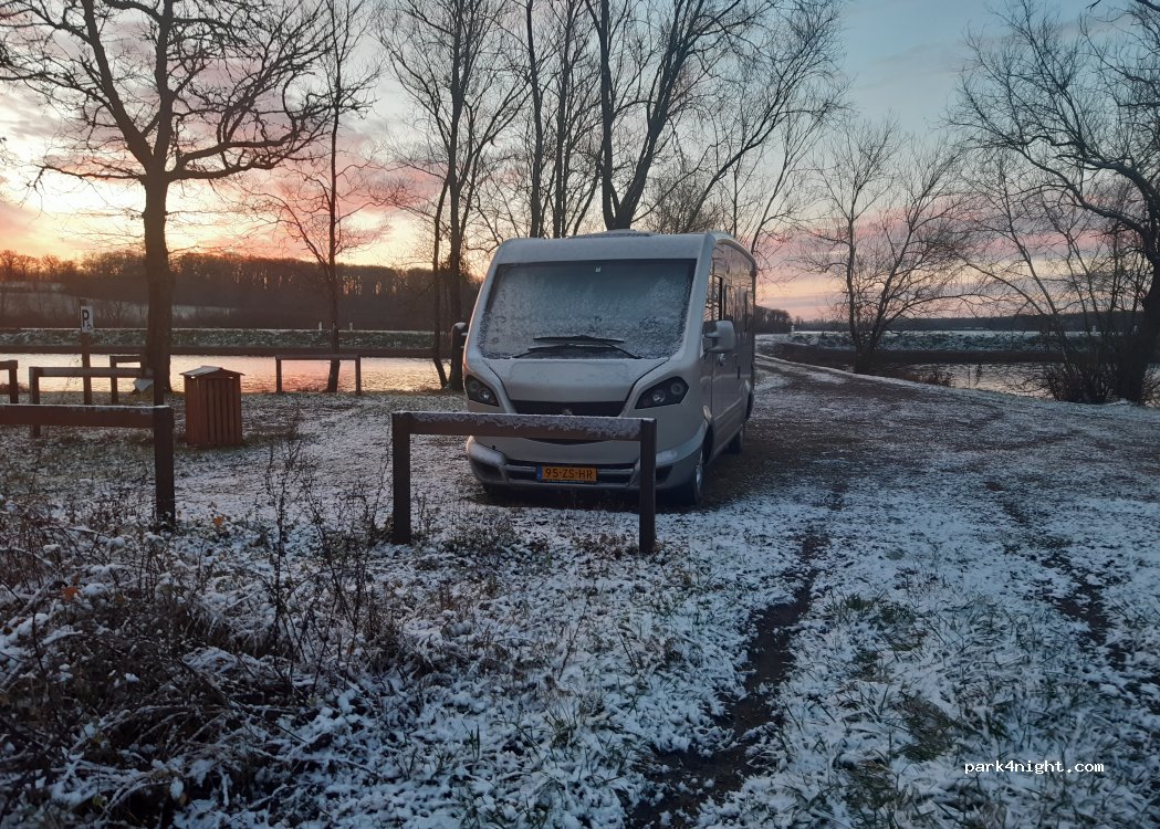 A little piece of heaven: parking with picnic tables, fitted out for fishermen on a peninsula in the middle of the pond. Not recommended to venture on the peninsula by motorhome if there are already other vehicles!