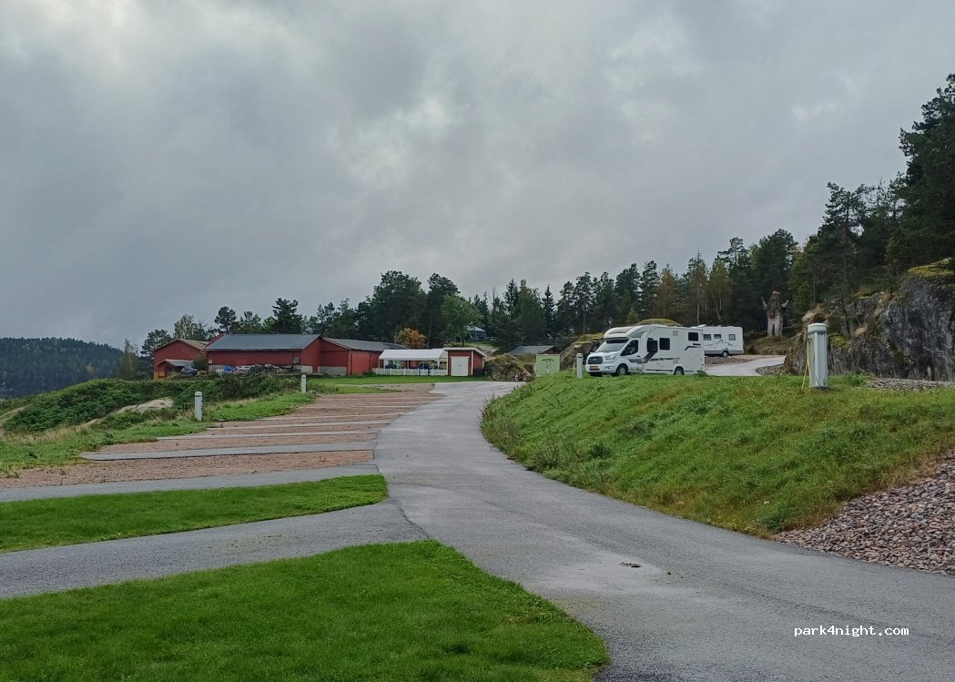 Schöner ruhiger und neu angelegter Stellplatz mit toller Aussicht. Plätze sind mit Rasen oder Schotter.Stellplätze sind vorab auf der Webseite reservierbar, leider nur auf Norwegisch. Aber GoogleTranslator hilft. Übrigens:Germany=Tyskland ;) Sanitäranlagen sind in einem Container, aktuell sehr sauber.Nebenan ist für Kinder ein Spielplatz, Streichelzoo und ein Funpark, aber alles gegen Bezahlung.