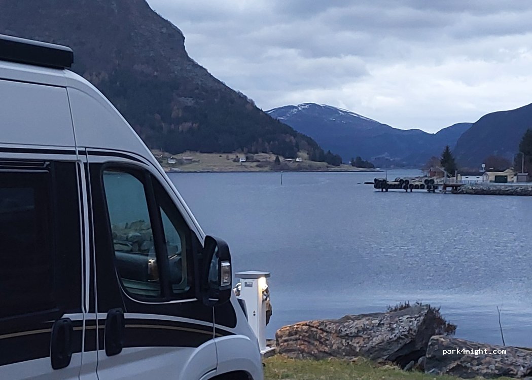 Campsite with cabins and a few RV and caravan spaces. Showers, laundry, kitchen, relaxation area, electricity, and Kset freshwater filling and emptying. All unpretentious, with a pretty little marina and welcoming and helpful staff. A superb view of the fjord, and everything is bustling with life. Not to be missed if you need rest, laundry, and a good time...