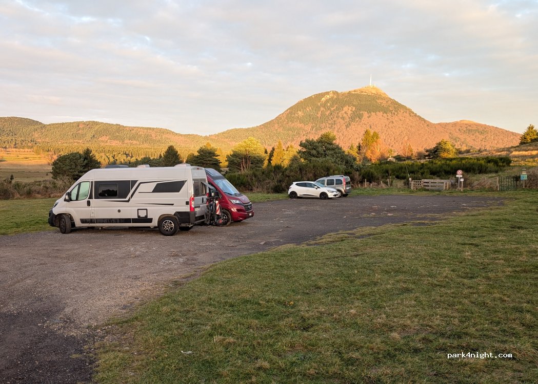 Parking très bien situé pour passer la nuit avant d aller au Puy de Dôme. Pas plat partout mais nous n étions pas trop nombreux en avril, chacun a ou trouver un emplacement correct. Près de la route juste un peu passante le matin.