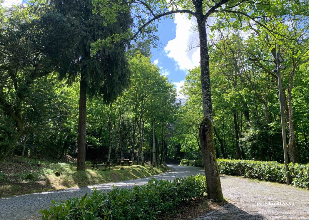 Nice flat stone paved parking under big trees (spectacular eucalyptus nearby) located about middle of 686 steps of monumental long staircase that lies “Nossa Senhora dos Remédios” sanctuary. 8 wooden picnic tables. Curious cave on opposite side of parking (after staircase crossing). Illuminated, overnight possible (maybe noisy due to attached stone paved road); no services.