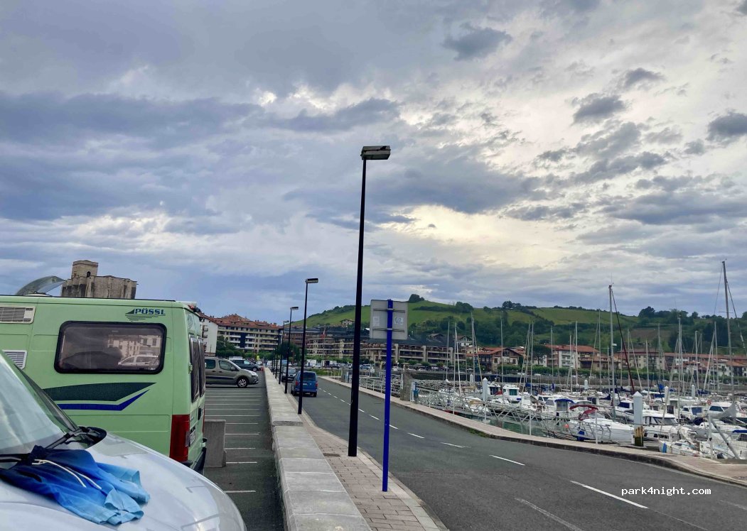 Veel parkeerplaats in rustig havengebied. Met bootje overgevaren naar het centrum . Kost 0.55 euro pp voor enkele reis. Je kan natuurlijk ook omlopen. Ruim 10 minuten. Aardige schipper. Andere kant van het centrum een zeer mooi strand (Itzurun Hondartza) met hele bijzondere rotspartijen. Rustige nacht gehad. Stonden met zeven campers. In het gezellige stadje restaurants en supermarkten.