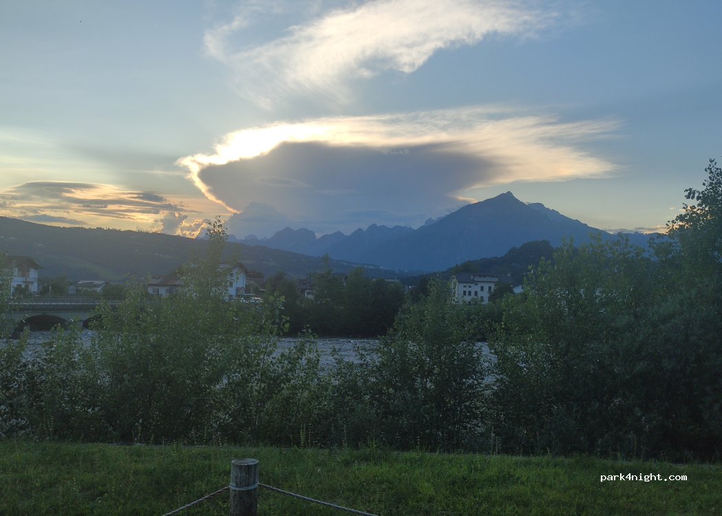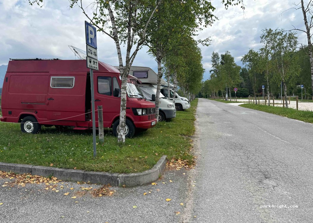 Op het eerste gezicht niet echt uitnodigend, maar als je links op het gras parkeert (8 plekken) richting rivier, dat zijn de CP plekken, camperlengte max. 7 m, heb je mooie rondompanorama op de bergen. Het meer ligt op 10 minuten lopen, over de brug linksaf het autovrije voet/fietspad op. Een supermarkt op 1 km, middagpauze van 13.00-15.00 uur, zondag gesloten. Geluid van hoofdweg stoort niet.