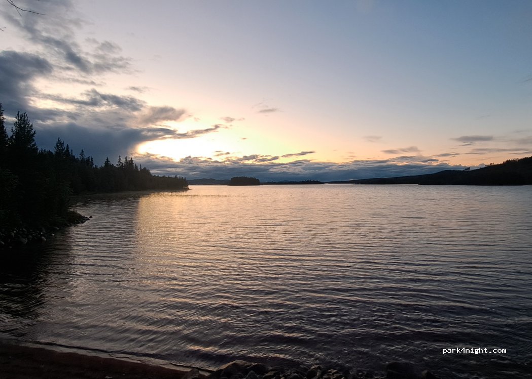 Wie beschrieben, kleiner Kiesparkplatz direkt neben der kaum befahrenen Naturpiste. Platz für 2 Womos, etwas uneben, Feuerstelle, Traumausblick auf den See
