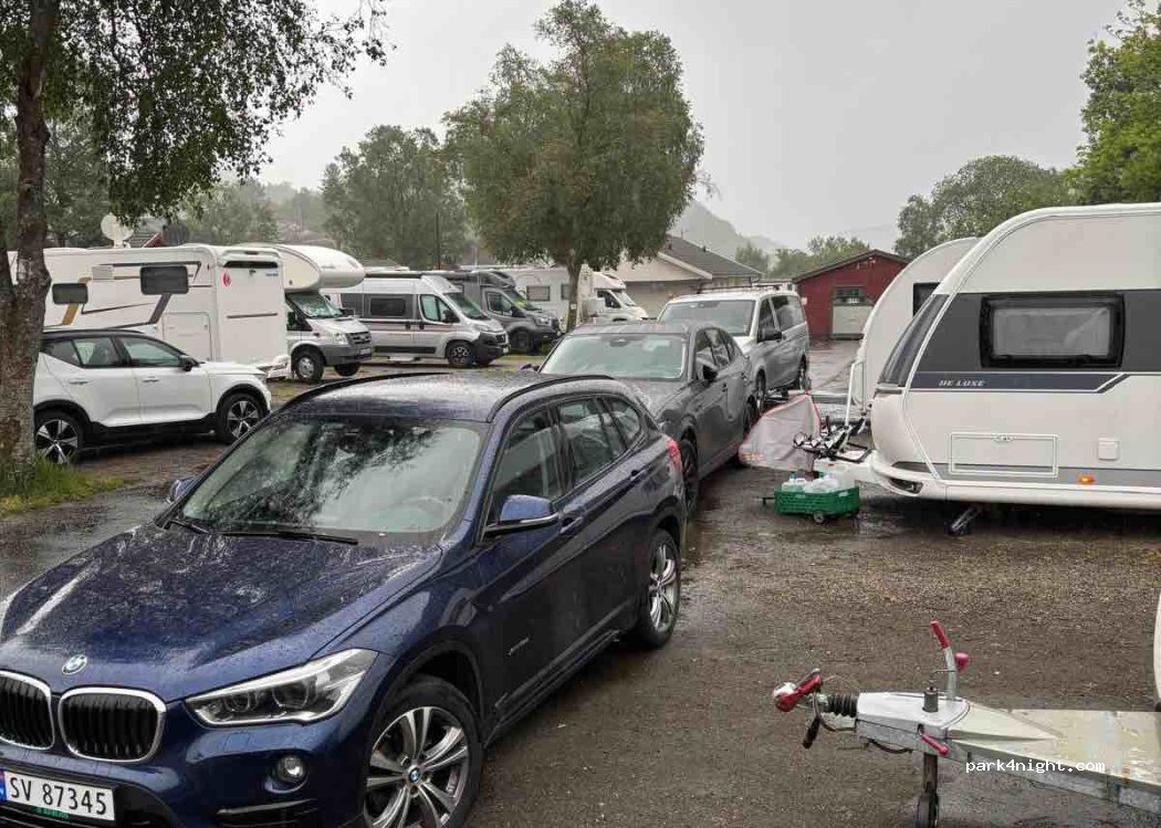 Accueil chaleureux. Emplacement libre, ms à 17h30 il est déjà bien plein. Calme de 20h à 7h du matin. Grande salle de bain très propre. Van électricité wifi douches pour 2 adultes 300Nok soit 26 euros. pour une nuit c est très bien.
