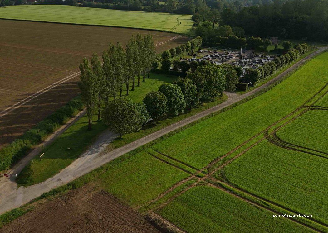 Parking du cimetière en pleine campagne. Endroit calme et bien ombragé. Passage de quelques tracteurs mais c'est normal, on est au milieu des champs !