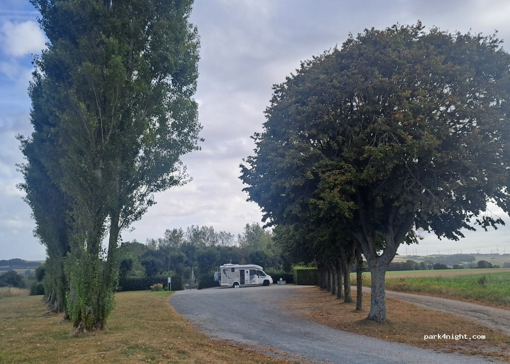 Good location to stop if driving to or from Calais. Perfect for my cat! Parking is in front of the cemetery. Very quiet, beautiful views. Saw two deer crossing the fields in the morning.