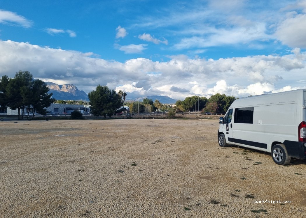 Großer Schotter Parkplatz. Mülleimer in der Nähe und ein Markt der donnerstags, samstags und sonntags einen schönen Trödel bietet.