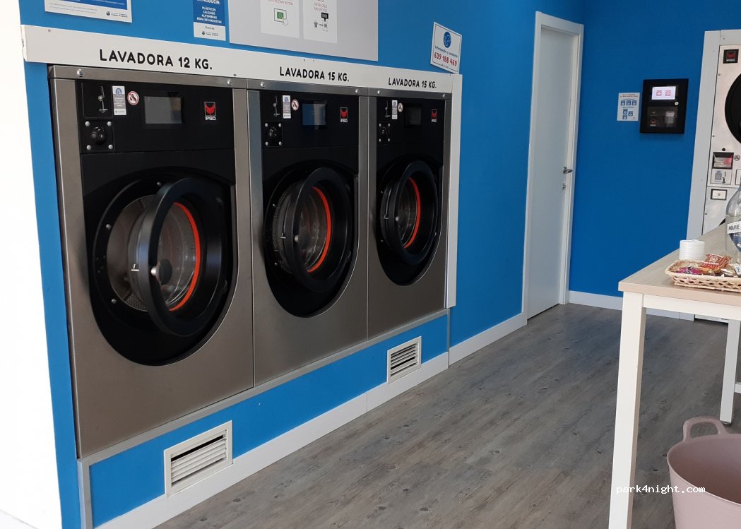 Excellent. Easy to park outside with 7.5m van (at least out of high season). 3 washers (1 x 12kg at €6. 2 x 15kg at €8). 3 dryers (2 x 14kg at €1 = 8 mins. 1 x 18kg at €1 = 6 mins). Very clean and spacious. Very helpful and friendly owner who speaks English. Change machine and credit card payment.