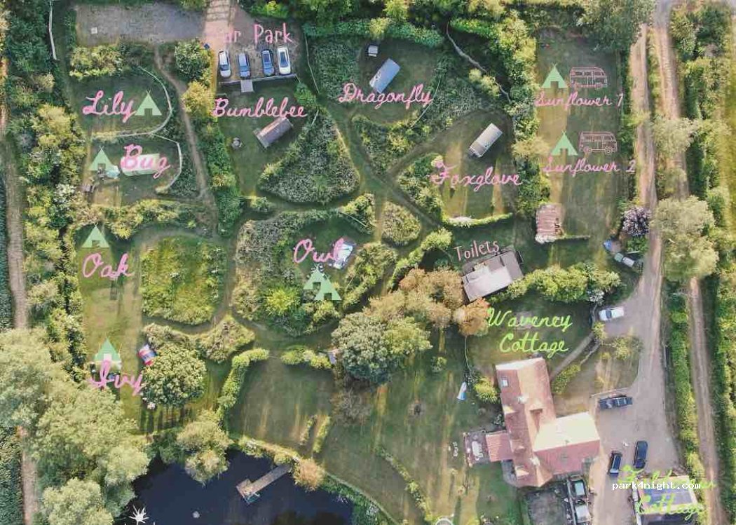 The Wildings Elms Meadow campsite - 2 Grass pitches with optional electric hook up for small to medium campervans (not motorhomes) in lovely paddock surrounded by hedges. (£30 without electric, £35 with electric). Great shower/toilet facilities, good wifi (possible for working), communal kitchen here with kettle etc. Often booked so call ahead. Hardstanding car park available for up to 2 campervans or motorhomes off season £20 without electric or £25 with.