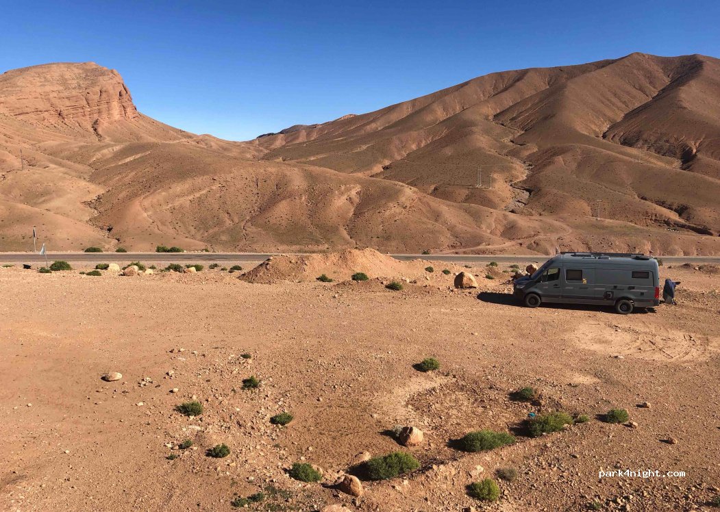 Guter, relativ ebener Platz oberhalb des Tals der Rosen. 2 bis 3 Camper können hier stehen. Mehr nicht, da die Anzahl der geraden Stellen beschränkt ist. Wir hatten eine sehr ruhige Nacht. Etwas versetzt zur Straße. Kein Verkehr in der Nacht nur ein bisschen Feierabendverkehr am Abend zu den letzten zwei/drei Siedlungen, die noch kommen, bevor die Straße endet.