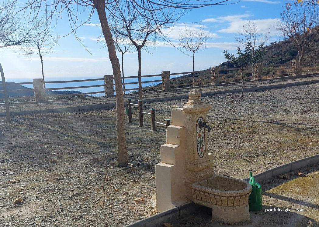 Gemeente park is goed onderhouden en schoon met 2 petanq banen. Helaas wordt de parking er naast gebruikt voor opslag bouwmaterialen en vuilstort. Als je laat arriveert goed voor een overnachting. Uitzicht op de plastic zee van kassen en heel in de verte de middellandse zee. Geen faciliteiten. Wij zijn verder gereisd.