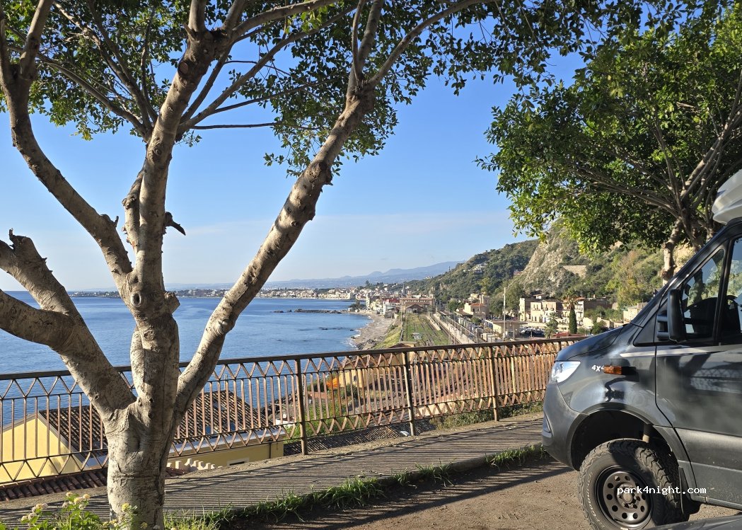 Spot parfait pour passer la nuit. Vue sur la mer. Très bien pour ceux qui n'ont pas peur de marcher un peu pour visiter Taormina. Il faut 30 mn de marche par la route ou un petit sentier normalement fermé. Le parking est fréquenté par les habitants des alentours, qui ne demandent rien.