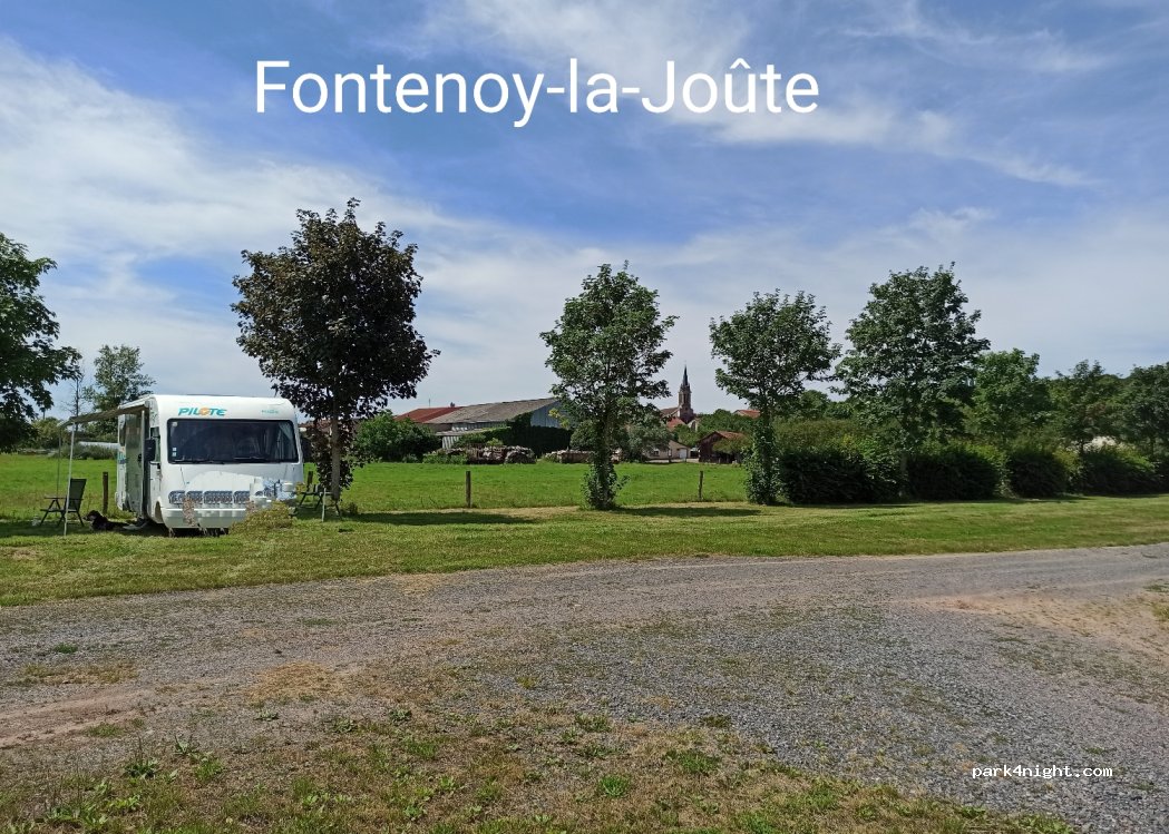 Spent 2 nights: August 5&6. Super spot. Quiet. Booktown. Lovely, easy walk (uphill). No shade. Free services. Thanks, Fontenoy-La-Joûte!