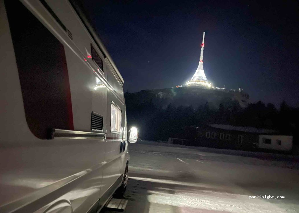 Velké parkoviště, bez služeb. Výborné místo s krásným výhledem na noční osvětlený Ještěd. Strávili jsme 1 noc bez sebemenších problémů. Mimo víkend a státní svátky překvapivě klidné. Ideální výchozí bod. Jediné mínus: parkovné nelze platit kartou; jen hotově. Cena 200,- CZK je za den; 0:00-24:00 hod, ne za 24 hod. Přenocování je tak za 400,- CZK.