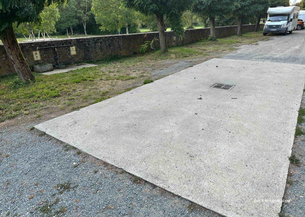 Tout ce qu’il faut pour passer un agréable moment. Sanitaires composés de wc, lavabos (avec prises électriques) et douche, de quoi également faire la vaisselle, vidange des eaux grises et noires, de quoi remplir son réservoir d’eau claire et le tout gratuitement. Le calme de l’endroit, près d’un petit parc, est la cerise sur le gâteau. Un grand merci à la commune de nous accueillir si bien.