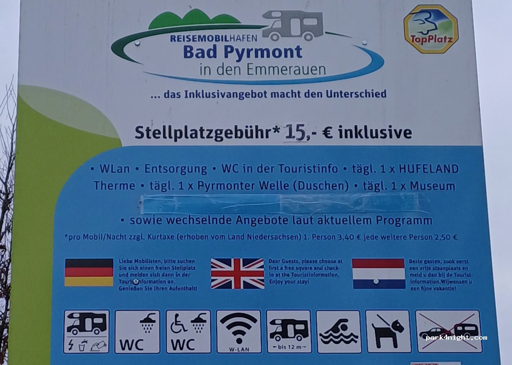 El espacio de estacionamiento está incrustado en una ubicación tranquila y natural al borde de una reserva natural, a solo 400 metros del centro histórico de la ciudad con los jardines del spa, el vestíbulo y la histórica avenida principal. Está abierto todo el año. La información turística, la piscina cubierta y al aire libre "Pyrmonter Welle", el parque de animales y las pistas de tenis están en las inmediaciones, al igual que los prados de Emmer, que invitan a dar un paseo, andar en bicicleta, relajarse y disfrutar de un caminar.
