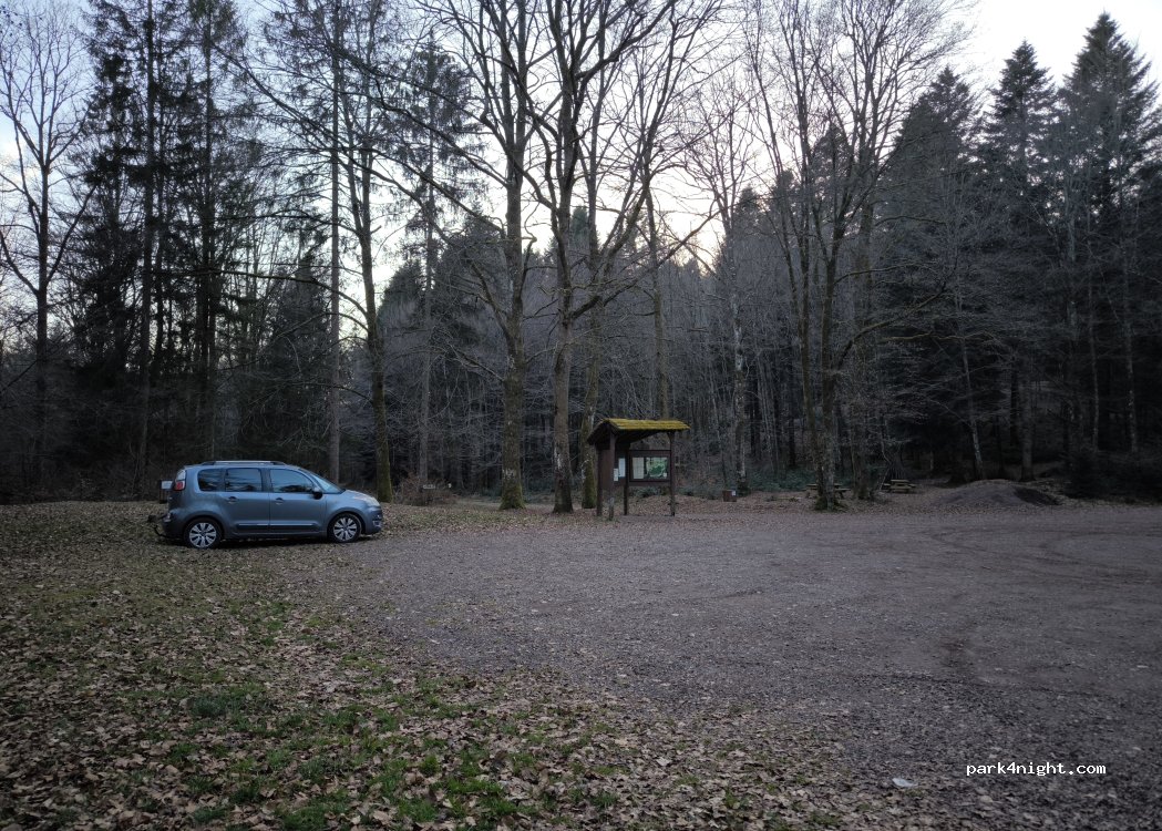 parking au coeur du massif forestier. parcours sprortif et pistes forestières. calme la nuit dans la journée des promeneurs et des travaux forestiers mais à 17h plus personnes. poubelles. le parc animaliers été fermé lors de notre passage. dommage.