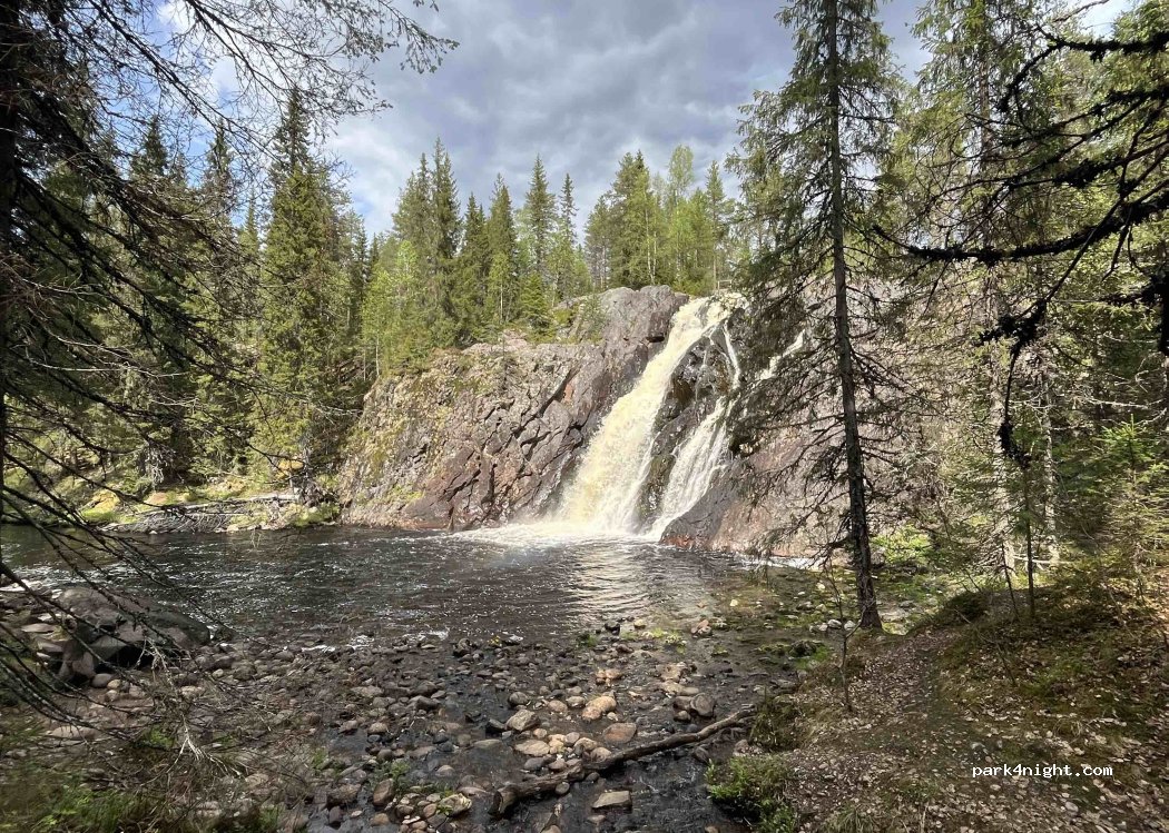 Parkplatz des höchsten Wasserfalls Finnlands (24 m). Zugang für Personen mit eingeschränkter Mobilität. Hervorragende Website und brandneue Einrichtungen. Trockentoiletten auf dem Parkplatz. 600m über dem Wasserfall: überdachter Grillplatz, Trockentoiletten, Laufsteg.
